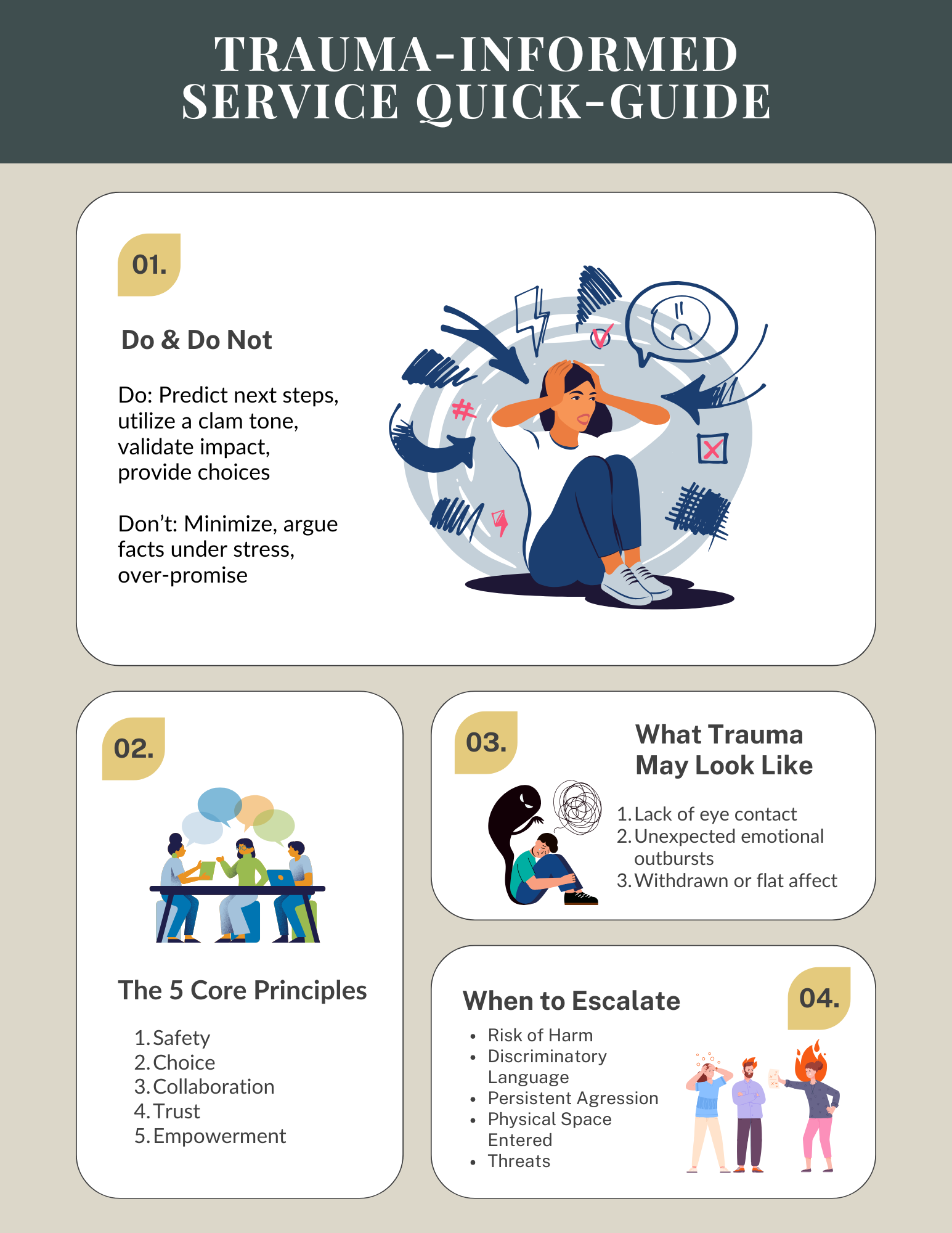 Five-Minute shift reset Download Five-Minute Shift Reset De-escalation Pocket Card Download De-Escalation Pocket Card 7-Day micro journal Download 7-Day Micro Journal Trauma-Informed Service Quick-Guide Download Trauma Quick Guide